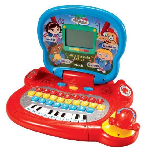 Put curious minds in the know with the Little Einsteins Learn & Go Laptop! This adorable preschool laptop teaches letters, numbers, music and other preschool skills through interaction with Little Einstein characters. Includes an ABC typing keyboard with 26 letters, music keyboard with 9 piano keys and LCD screen. Measures 9" x 11.2" x 2.4". Requires 3 "AA" batteries, included.Available at Amazon